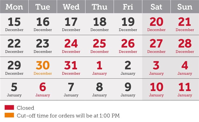 On December 30th, the cut-off time for orders will be at 1:00 PM.